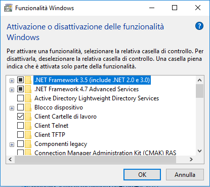 • Aggiungere la spunta alla voce .NET Framework 3.5 (include .NET 2.0 e 3.0) e cliccare su OK;