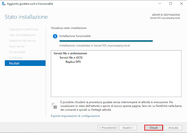 - Nella finestra successiva vengono visualizzati gli esiti delle operazioni eseguite nella creazione di un nuovo gruppo di replica. Cliccare su Chiudi